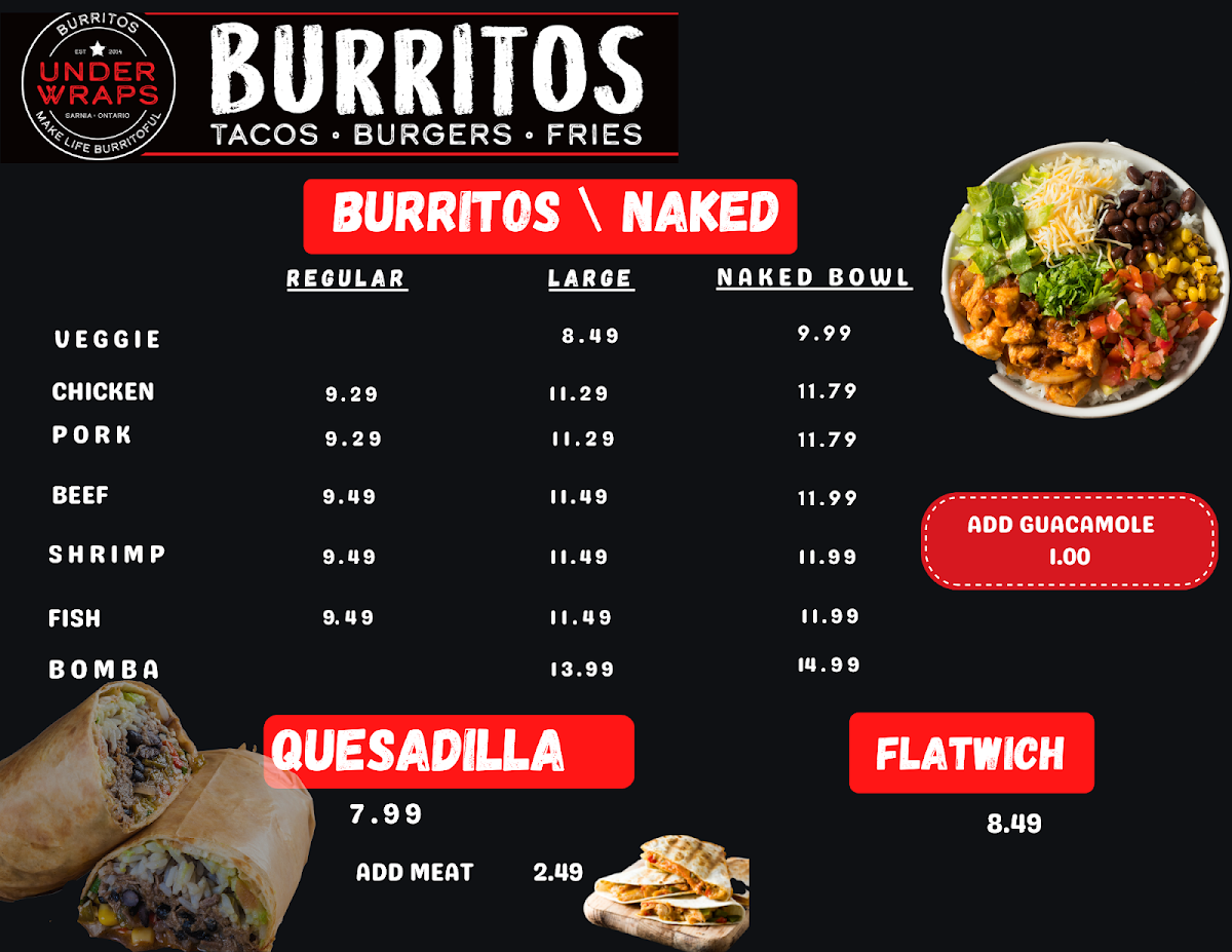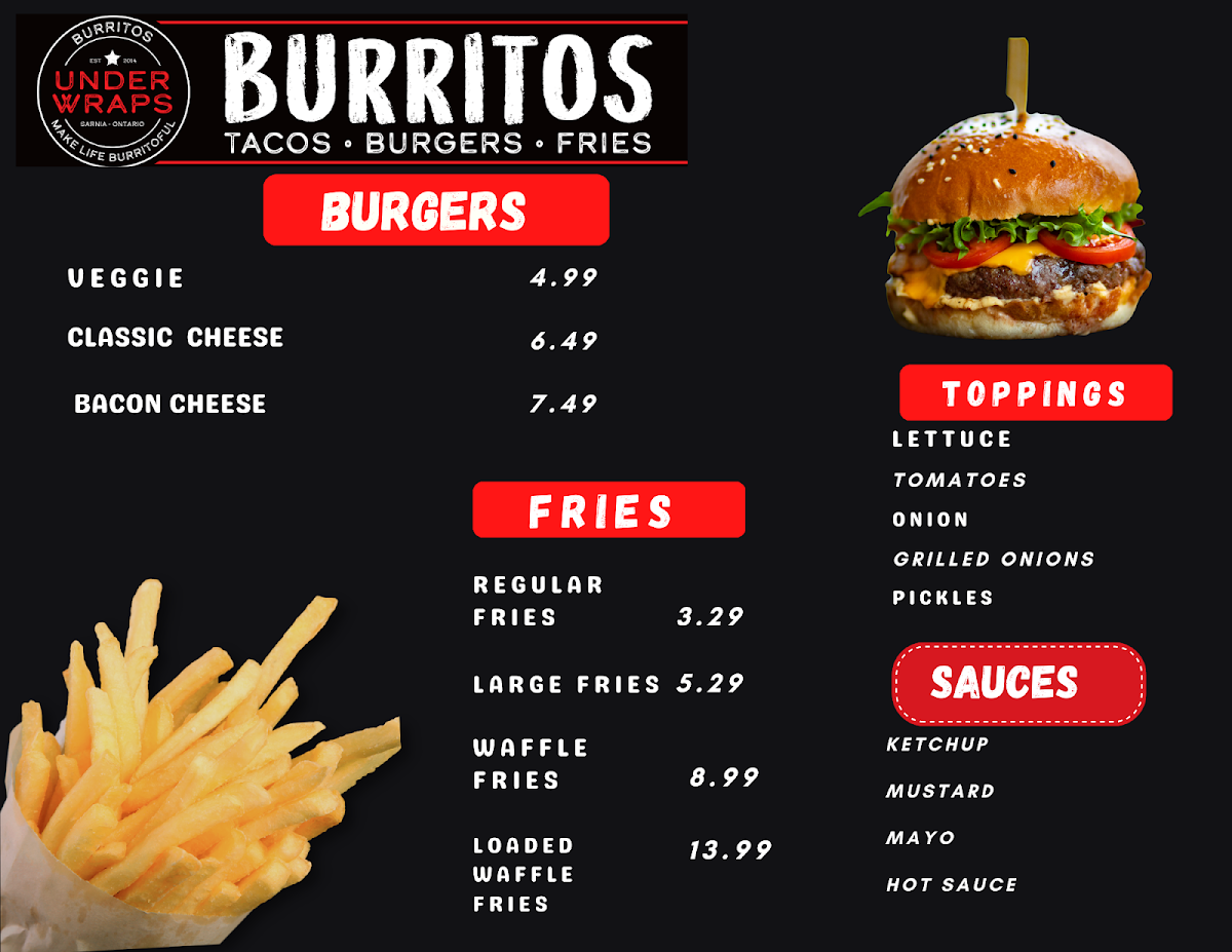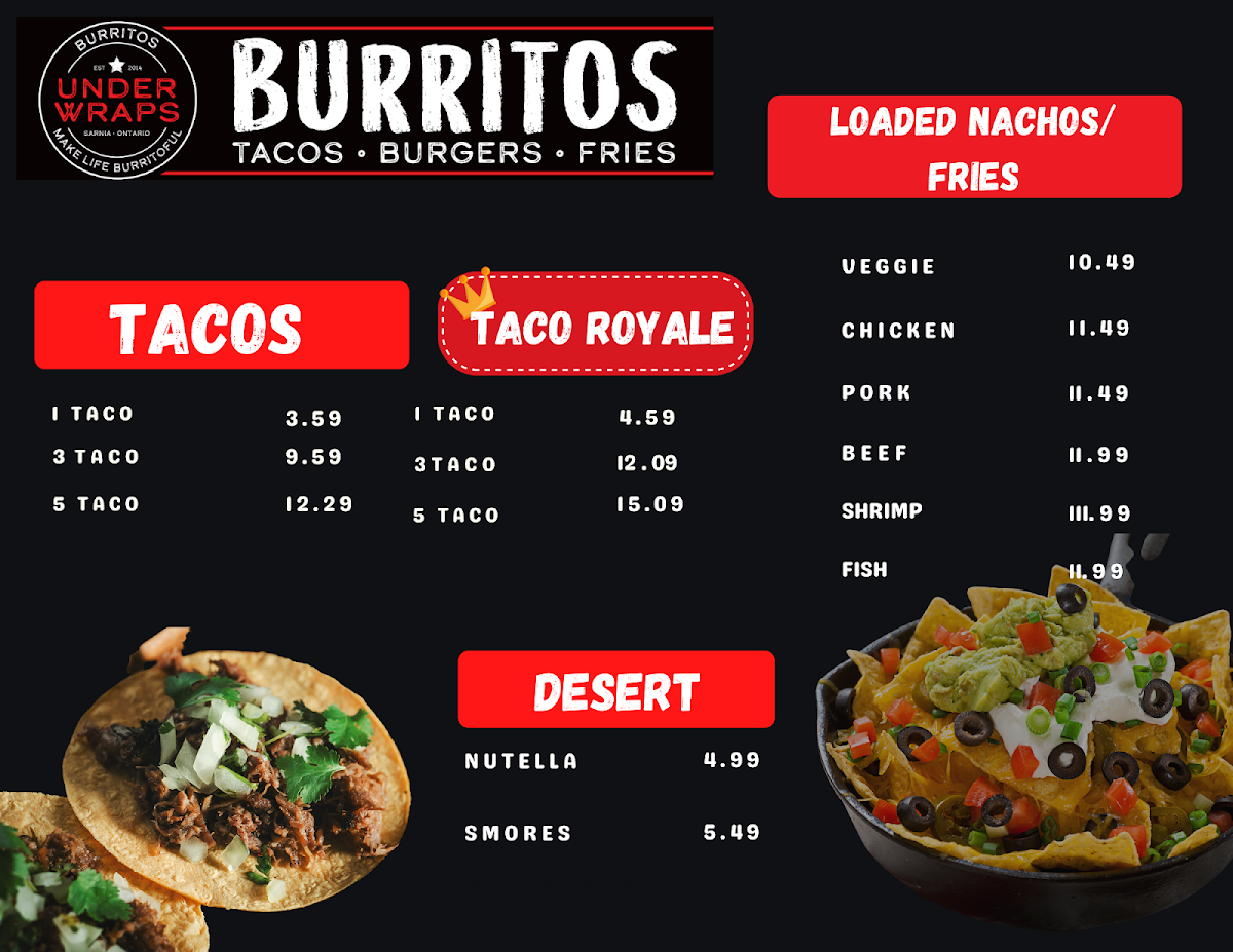 Located at 580 Murphy Rd in Sarnia, ON, Under Wraps Burritos is a must-visit spot for all burrito lovers. The menu offers a variety of delicious options ranging from traditional burritos to loaded nachos, tacos, quesadillas, and more.